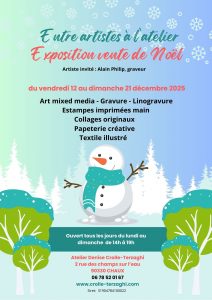 Denise Crolle-Terzaghi nous ouvrira les portes de son atelier pour son exposition vente de Noël du vendredi 12 au dimanche 21 décembre 2025. Venez découvrir ses créations, ainsi que celles de l’artiste invité, Alain Philip, graveur. Plus d’informations sur l’affiche ci-après.